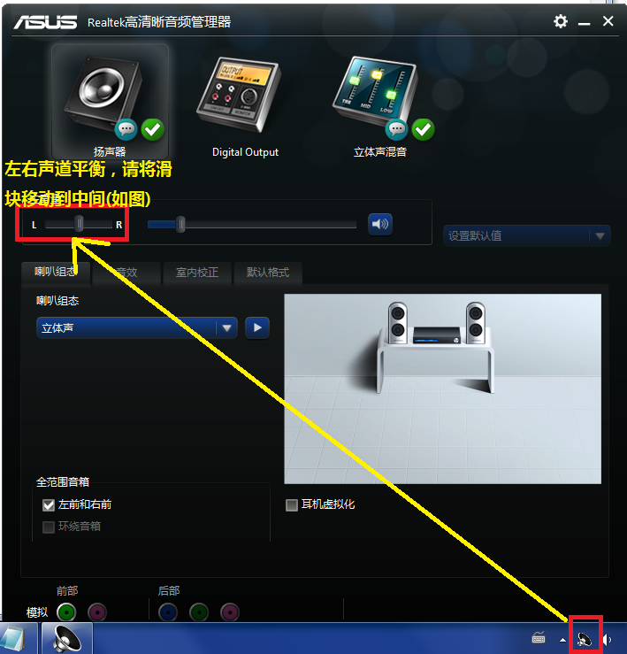 A: 出现此问题,应该是您曾经调节过(或无意中调节过)左右声道平衡