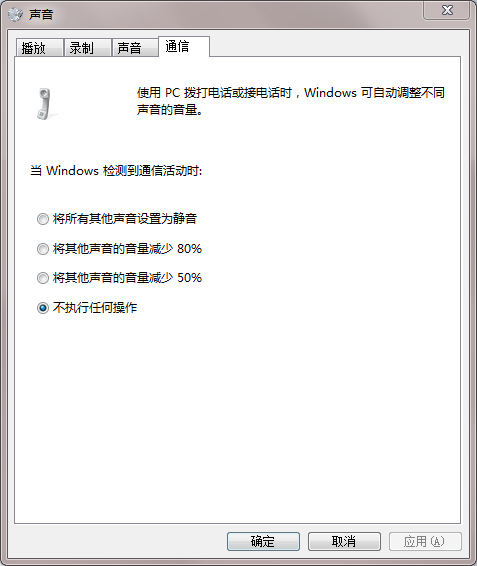 A: 连线时使用windows通信设备,windows系统默认会在通信时,自动降低其他声音音量,请参照下图设置为“不执行任何操作”
